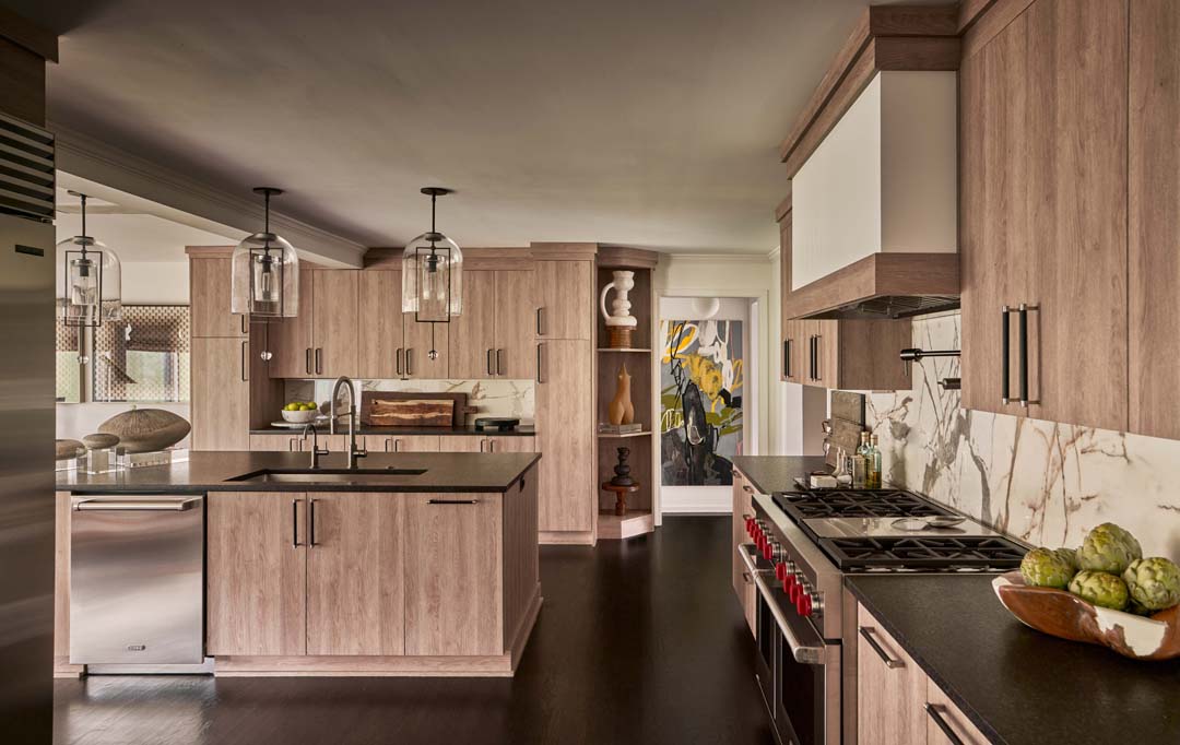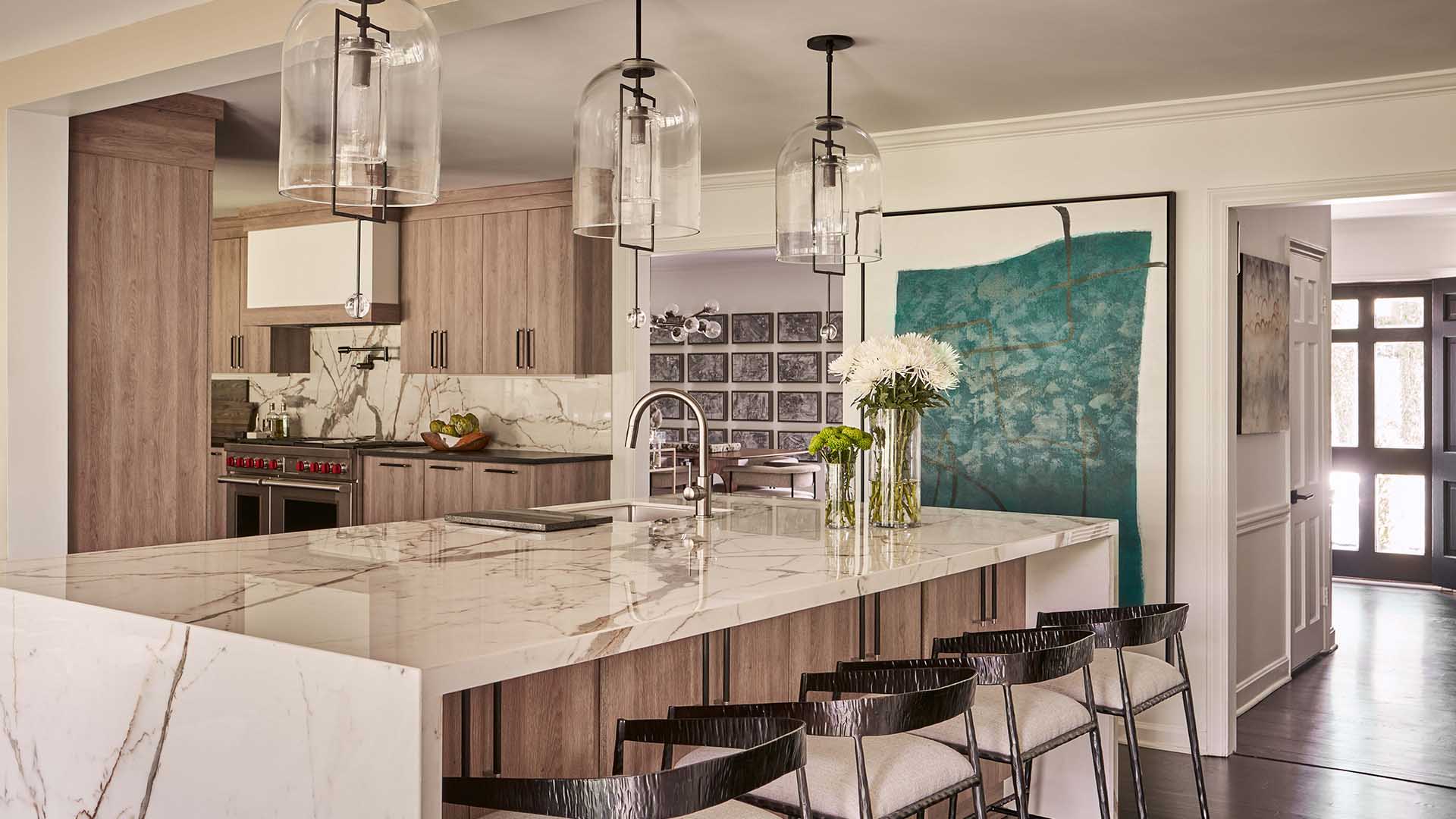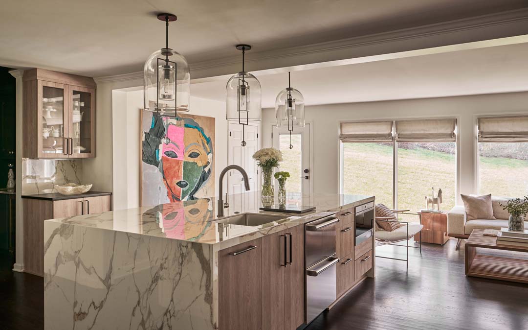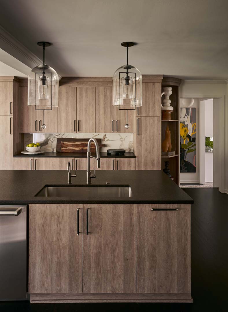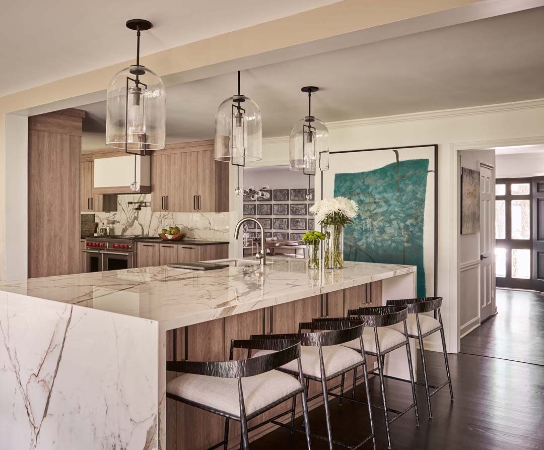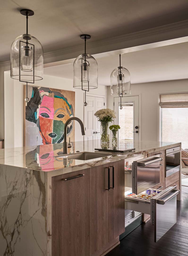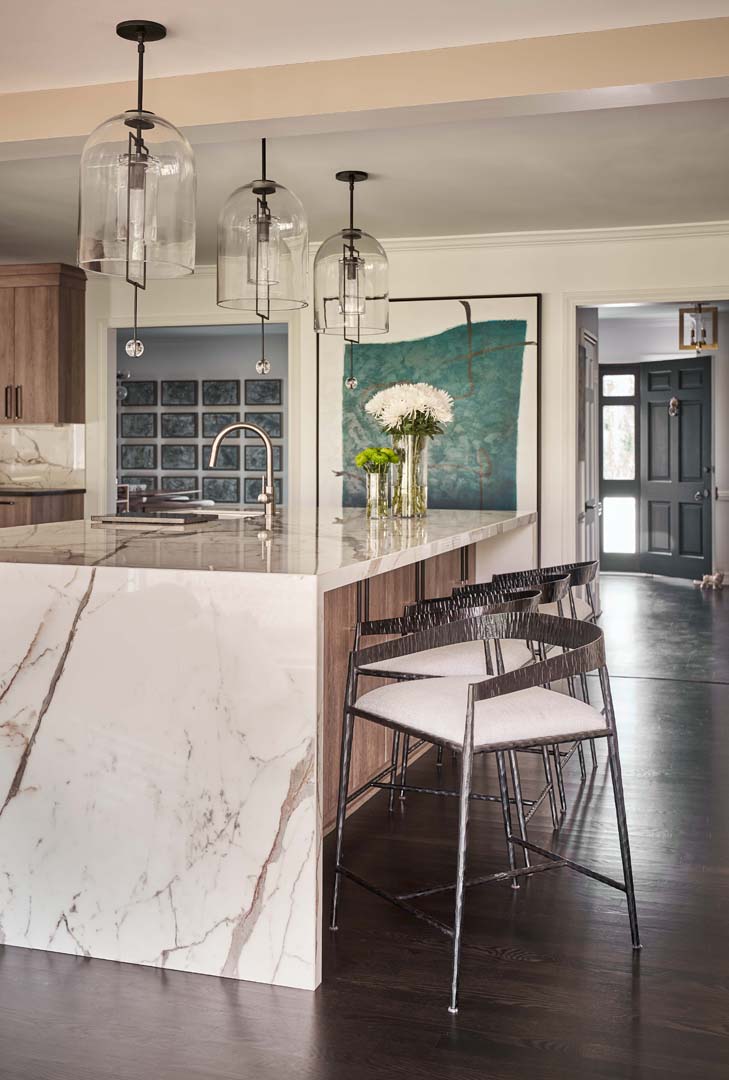 For this project, we completely reimagined the kitchen and back of the house, gutting the existing layout to create a more open, functional space. Knowing our clients love to entertain, we designed a stunning double island in the kitchen—perfect for both hosting and everyday living. The laundry room was fully renovated to maximize efficiency and storage. We also added a bold, color-drenched bar area, turning it into a standout feature that enhances their entertaining experience.
